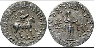 Azes II, 35 BC - 5 AD, Tetradrachm, Obverse: Emperor on horseback right, Reverse: Athena standing right, arm extended, spear and shield, monogram to left and right.